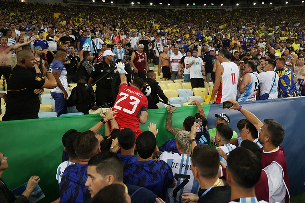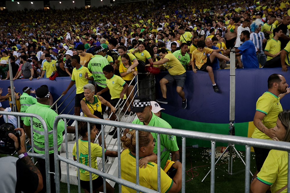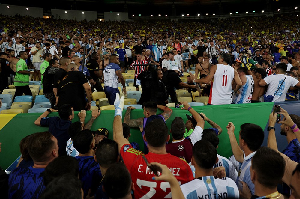 90deqiqe.az xəbər verir ki, Dünya Çempionatı - 2026-nın seçmə mərhələsi çərçivəsində keçirilən Braziliya və Argentina matçında iki ölkənin dövlət himnlərinin səsləndirilməsi zamanı azarkeşlər arasında münaqişə yaranıb. Oyun Bakı vaxtı ilə saat 4:30-da başlamalı olsa da, matçın startı təxirə salınmalı olub. Belə ki, dövlət himninin səsləndirilməsi zamanı bir neçə azarkeş arasında dava düşüb və sonda bu, böyük qalmaqala çevrilib. Azarkeşləri ayırmaq üçün polis müdaxilə edib. Asayiş keşikçiləri onlara tribunadan çıxarılmış stullarla vuran dava iştirakçılarına qarşı dəyənəkdən istifadə edib. Argentina millisinin hücumçusu və kapitanı Lionel Messi komanda ilə birlikdə tribunalara gedərək azarkeşləri sakitləşdirməyə çalışsa da, cəhdləri uğursuz alınıb. Bundan sonra o, komandanı meydandan kənarlaşdırıb. Braziliyalı futbolçular isə meydançada rəsmilərin qərarını gözləyiblər.