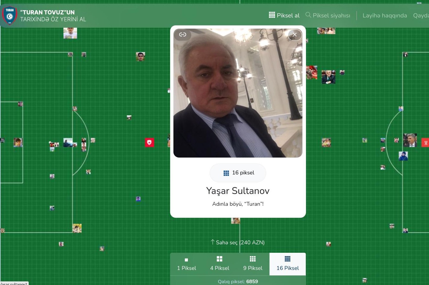Azarkeşlər 30 illik yubileyini qeyd edən Azərbaycanın ilk rəsmi Peşəkar Futbol Klubu olan “Turan Tovuz”a dəstək məqsədilə ianə edərkən aldıqları piksellərə öz şəkillərini yerləşdirə bilərlər. İanəçilərin fotoları klubun avtobusunun üzərində yer alacaq və stadionun seçilmiş ərazisindəki lövhədə öz əksini tapacaq. Hazırda həmin avtobusun alınması üçün 6859 piksel qalıb.