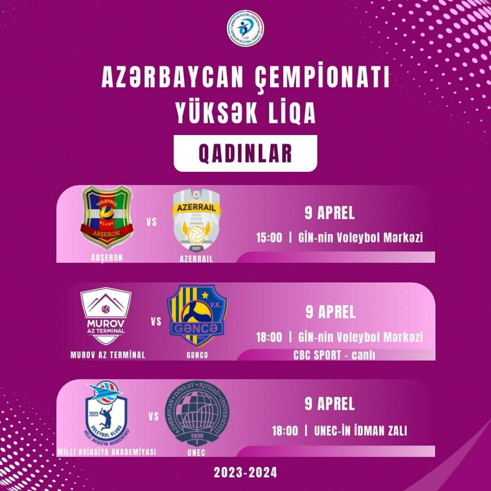 Günün ilk matçı GİN-nin Voleybol Mərkəzində saat 15:00-da “Abşeron” və “AZERRAIL” komandaları arasında olacaq. Ardınca meydançaya “Murov Az Terminal” və “Gəncə” kollektivləri çıxacaqlar. Saat 18:00-da başlayacaq bu görüş “CBC Sport” kanalı vasitəsilə canlı yayımlanacaq.